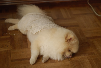 濡れタオルとポメ